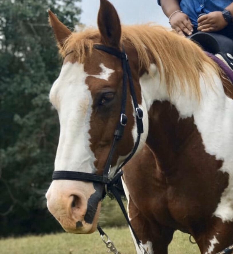 Noche is a registered paint mare that that was bred for her Overo color until she had health problems and discomfort concerning a swollen eye. We took her for treatment at the Veterinary Teaching Hospital at the University of Georgia and a cancerous tumor was found, along with a respiratory infection called pythiosis. The eye was removed successfully, the pythiosis was treated with an experimental vaccine therapy, and Noche has achieved a full recovery. She has been a great partner working with people that have physical disabilities, and has provided many rides for our clients who use a wheelchair. Her best friend is Shawnee, who was donated along with her to our program.