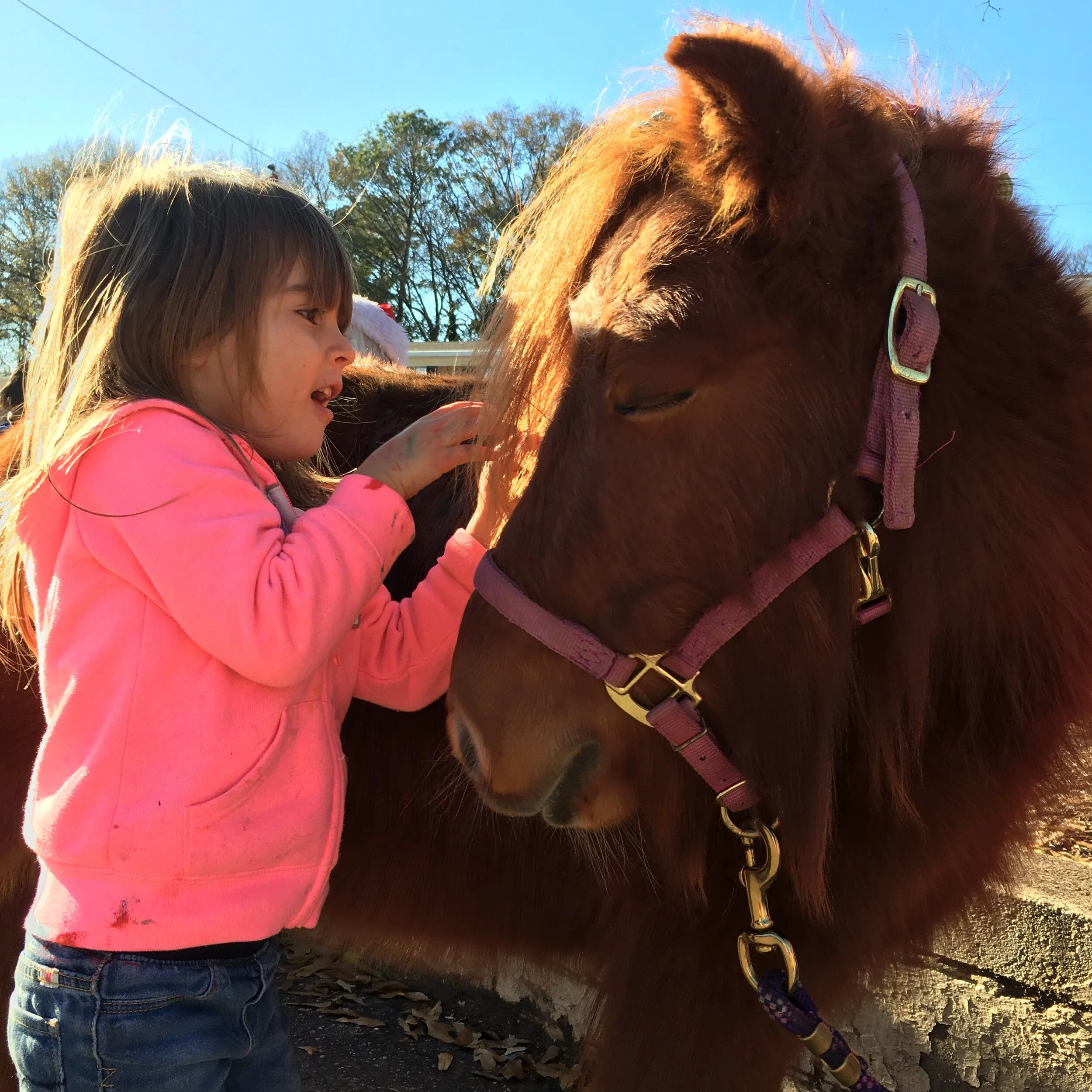 Mason came to us from the Georgia Equine Rescue League with three other mini horses. When they were rescued from a neglect situation Pinky was pregnant with Mason. He had an under-developed eye, possibly from malnutrition, and had it removed at two weeks old. They were surrendered to G.E.R.L after their owner became ill and could not longer care for them. When he came to us he was definitely the spoiled baby! After patiently teaching him proper manners, he has become a wonderful partner in therapeutic sessions.