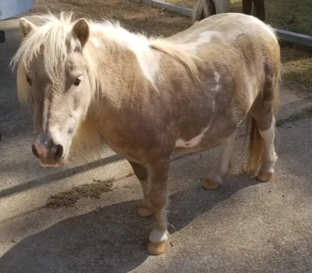 Shrek came to us from the Georgia Equine Rescue League with three other mini horses. They had been rescued from a neglect situation and the kind rescuer became ill and could no longer care for them. He is a good-natured soul; very patient and tolerant. He enjoys giving rides to small children and enjoys their company.