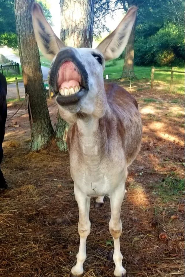 Peaches, a mammoth donkey, came to us from a Georgia horse rescue with her mom, Cookie. She is very affectionate and a little mischievous… she loves to steal hats and ponytail holders from her human friends’ heads! She enjoys hugs when she is offered one. We are working with her and Cookie to begin a therapeutic driving program and be comfortable with riders.